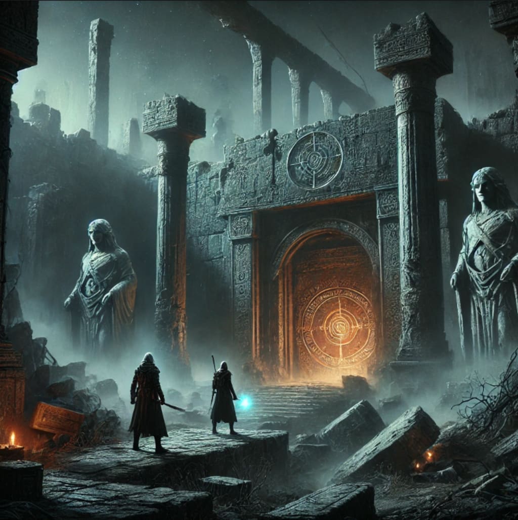 As they approached the ruins, the landscape became eerier. The once-magnificent city of Vithra, now a decaying skeleton of its former self, stood like a graveyard of lost history. Massive stone pillars lay crumbled, half-buried in the ground. Broken statues of ancient gods watched over the desolation, their faces eroded by time and weather. The air was thick with an unsettling quiet, as if the very earth mourned the fall of the empire.