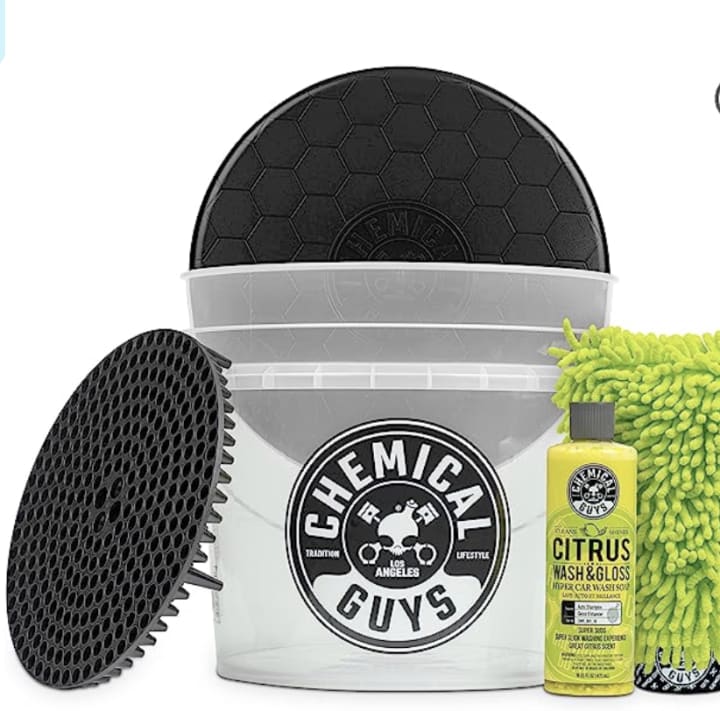 The car cleaning kit offers convenience and efficiency by providing a comprehensive set of tools and products. It includes a rugged detailing bucket, a Dirt Trap Car Wash Bucket Filter, and a Citrus Wash & Gloss car wash soap. The snap-on lid offers storage and doubles as a comfortable seat for detailing wheels and exhaust tips.