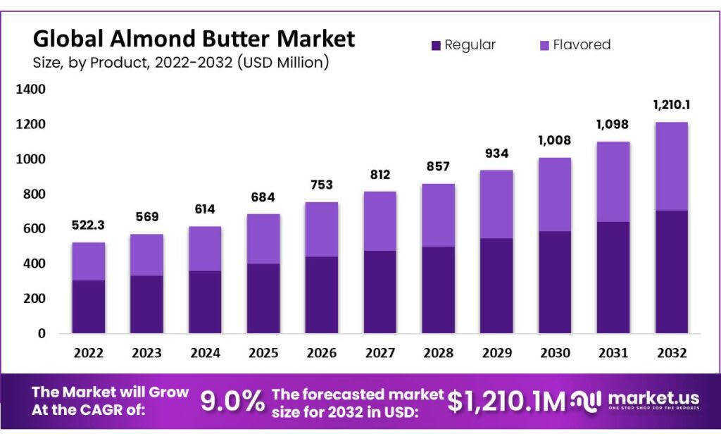 Global Almond butter market was valued at USD 522.3 million and is expected to grow USD 1210 million in 2032. Between 2023 and 2032, this market is estimated to register a CAGR of 9.0%.