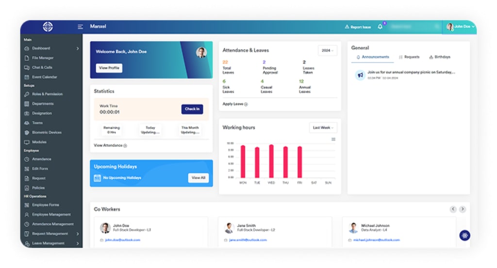 Manxel HRMS streamlines core HR functions through intelligent automation that reduces administrative burden and eliminates inefficiencies. Tasks like attendance tracking, payroll processing, and performance evaluations become seamless, enabling HR professionals to redirect their focus toward high-impact initiatives. This shift accelerates productivity across the board and aligns HR efforts more closely with business goals.
