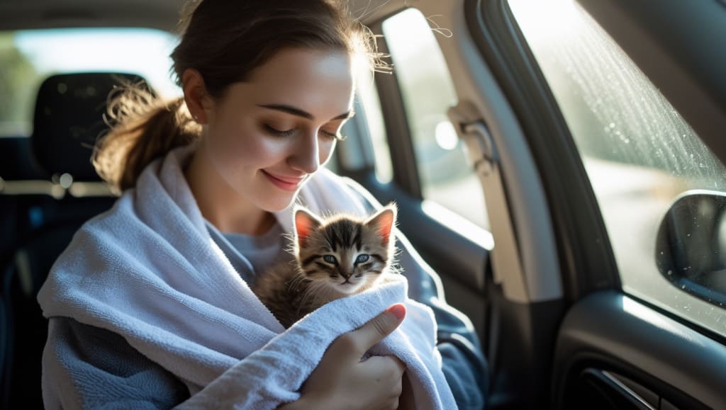 The kitten has found a new home, the young woman is taking it home. The cat is no longer alone—it now has a new family, who will love and care for it.