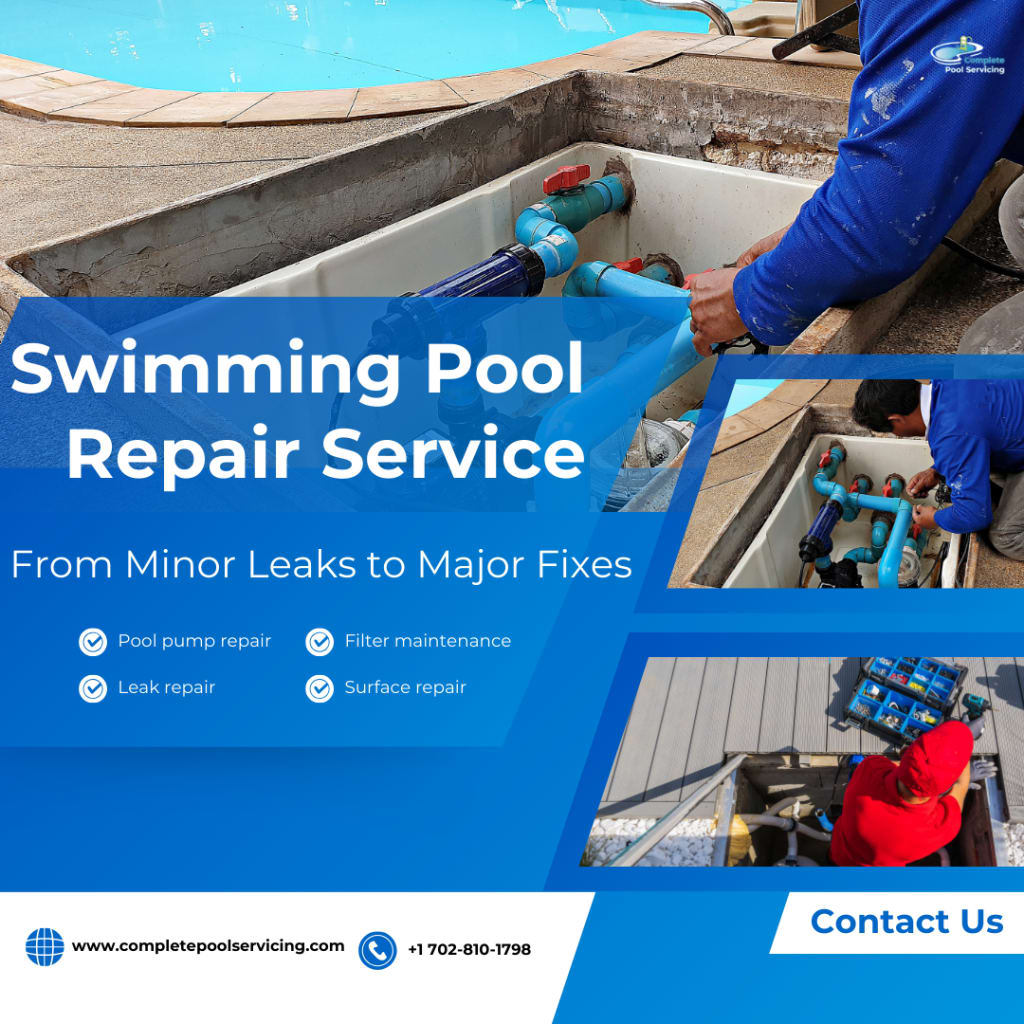 Swimming pool repair service is very important for your pool to increase its life and reduce maintenance cost. Complete Pool Servicing company provides best pool services at affordable prices in Las Vegas ,Henderson ,Nevada. We have more than 10+ years experience in pool services.