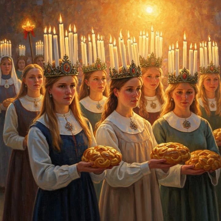 It captures the essence of St. Lucia’s Day as celebrated in Scandinavia - candle crowns glowing in the darkness, white robes with red sashes, and the warmth of saffron buns and mulled wine shared in community.