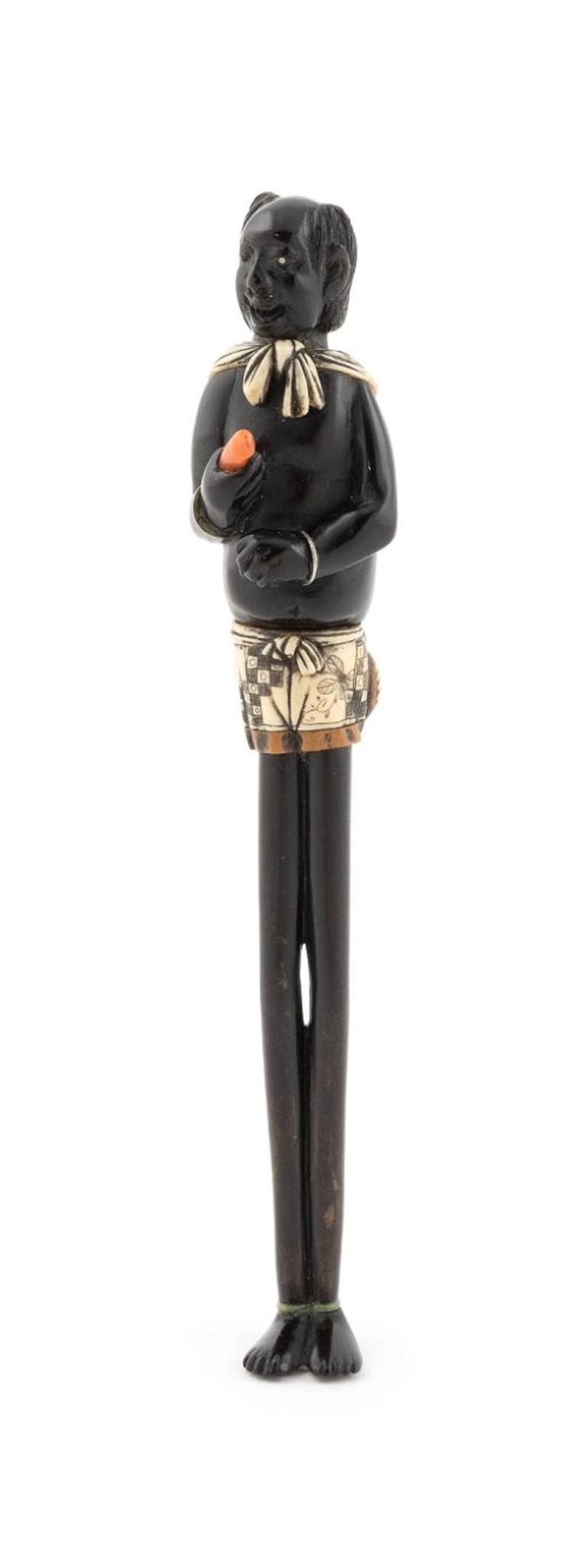 One of the most notable pieces in the auction is Lot #0638, attributed to the late 19th-century Japanese artist Kyokusei. This wood and ivory netsuke, estimated at $12,000 to $15,000, depicts a tall islander with lifelike details, including oversized feet, inlaid eyes, and a coral accessory. Kyokusei was renowned for his playful depictions of native figures and his ability to create striking contrasts using materials like ebony, ivory, and coral.