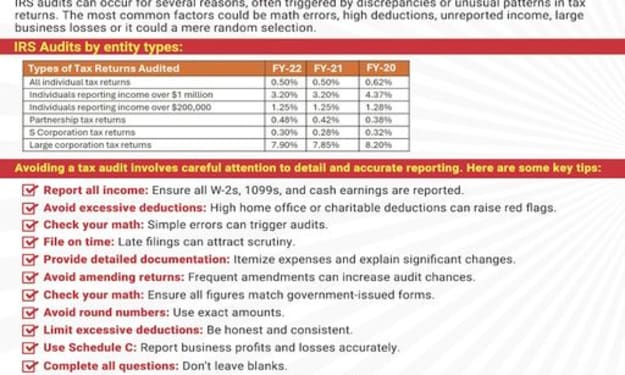 IRS audits can be stressful, but with the right preparation, you can minimize your chances of being audited. Audits often stem from discrepancies or unusual patterns in tax returns. Common triggers include math errors, large deductions, unreported income, and significant business losses. Here’s a snapshot of audit rates by entity type for FY-22: