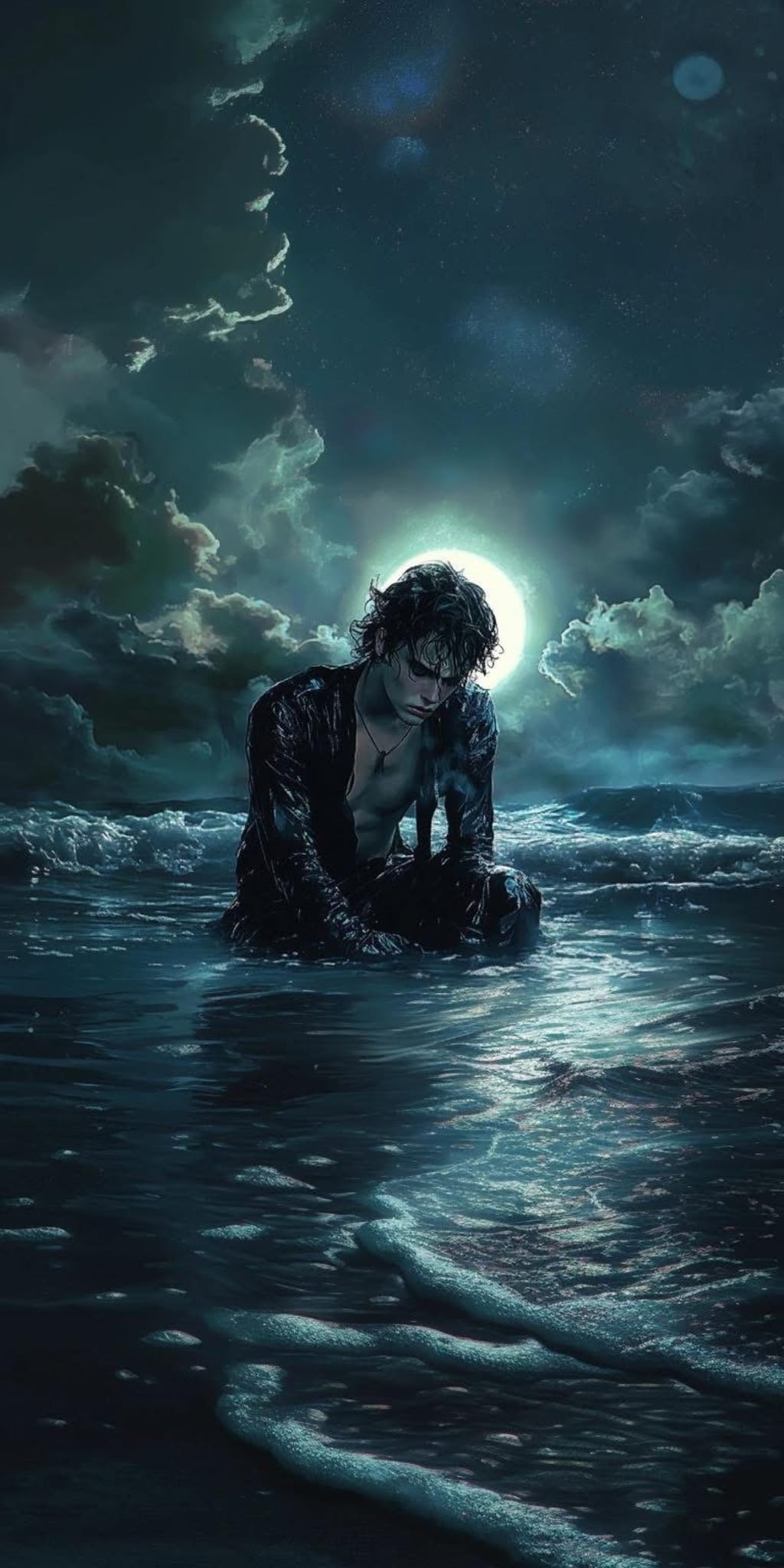 In the moonlight I could just make out the shape of him. Dark, wavy hair wet from the sea. Pale skin catching the light like a polished blade. His face held both softness and pain. His lips were parted, as if whispering to something no longer listening.