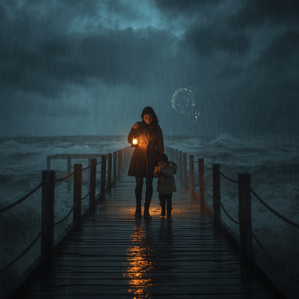 Step by careful step, they crossed the pier. The spirit lingered for a heartbeat, then dissolved into the rain, leaving behind a calm that seemed impossible moments ago. Amina exhaled, clutching Sami tightly. The lantern, battered and damp, still burned—proof that even the smallest light could pierce the darkest storm.
